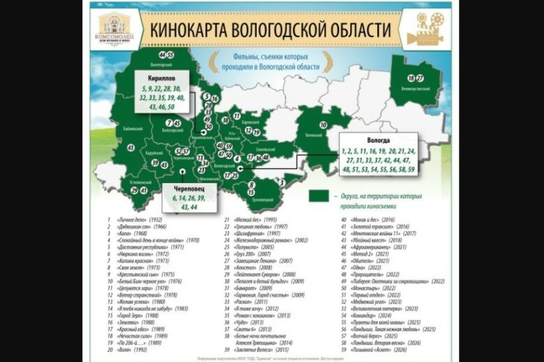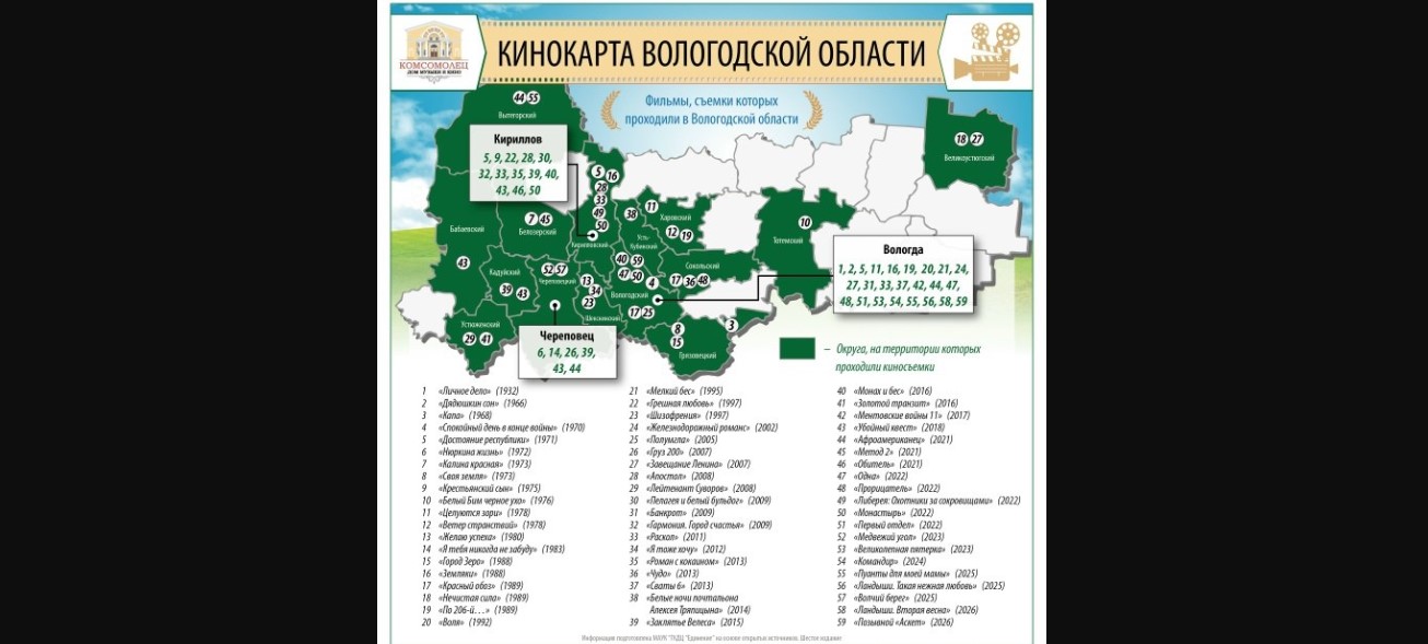 Всего на кинокарту области нанесено 59 фильмов и сериалов.