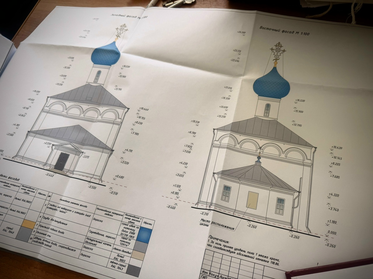Проведенное исследование показало, что центральный купол был сине-голубого цвета. Этот оттенок восстановят, а крест позолотят. На фасадах храма в дальнейшем появятся иконы Илии Пророка и Господа Вседержителя.