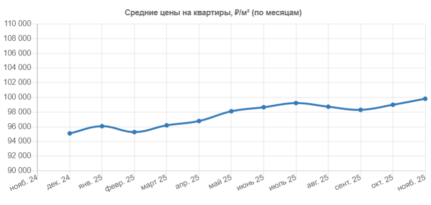 Если сравнить цены годичной давности, то, например, средняя цена квадратного метра в двухкомнатной квартире в ноябре 2024 года составляла 94 196 руб., то год спустя тот же квадратный метр стоит 99 821 руб., что всего на 1,06% выше.