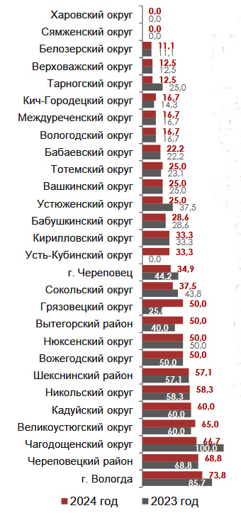 «Наиболее высокие показатели по количеству учреждений, здания которых находятся в аварийном состоянии или требуют капитального ремонта, отмечены в городе Вологда (73,8%), Череповецком округе (68,8%) и Чагодощенском (66,7%) округе. Самые низкие показатели по количеству учреждений, здания которых находятся в аварийном состоянии или требуют капитального ремонта, отмечены в Харовском (0%) и Сямженском (0%) округах», — написано в документе.