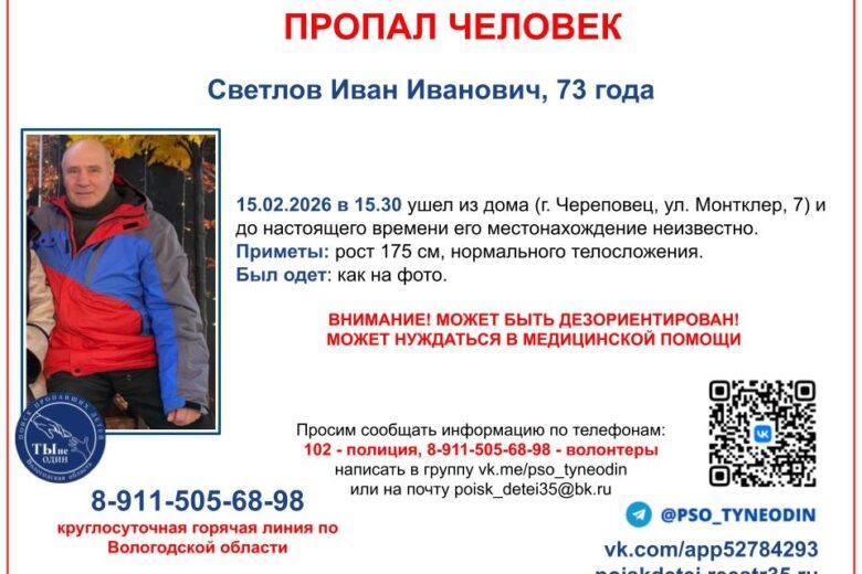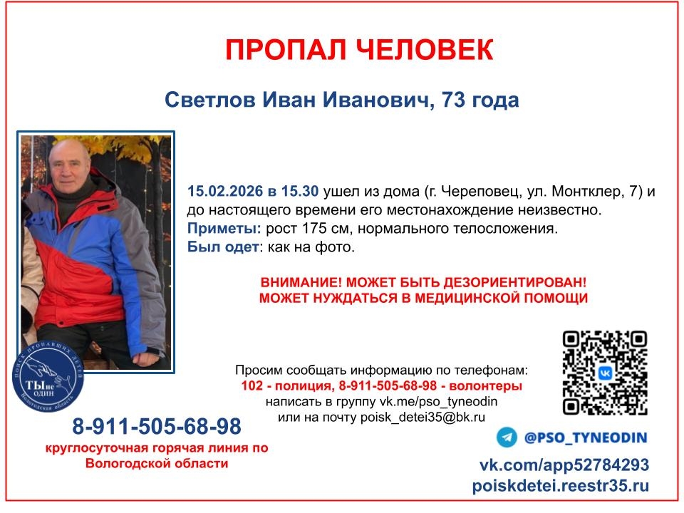 Рост пенсионера — около 175 сантиметров, мужчина нормального телосложения. Был одет в ту же одежду, что и на фото. Ситуацию усугубляет то, что череповчанин может быть дезориентирован, есть вероятность, что понадобится медицинская помощь.
