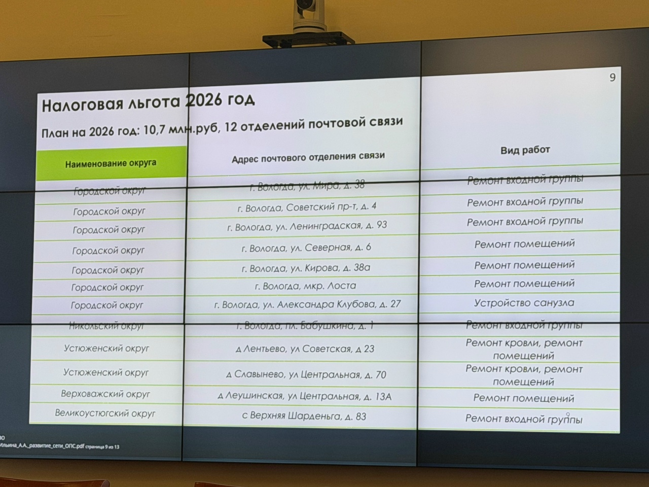 Министр цифрового развития Вологодчины Анастасия Андреевна Ильина опубликовала список почтовых отделений, которые включены в план ремонта на 2026 год. Их оказалось 12, и большинство находятся в Вологде.