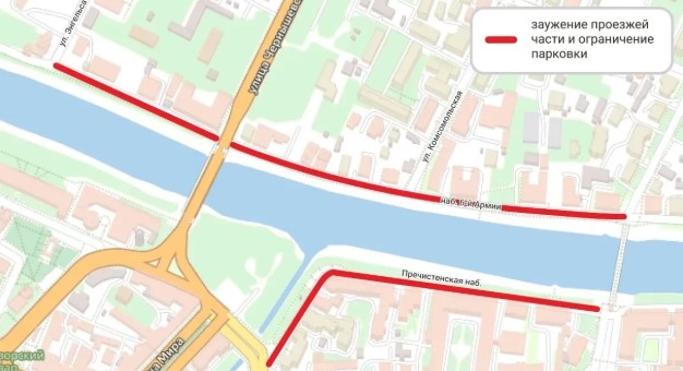 Ограничения действуют с 17 апреля и касаются движения по обеим сторонам набережной. Подрядчик приступил к работам на втором этапе благоустройства.