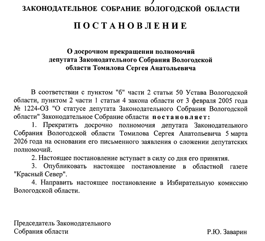 Законодательное собрание Вологодской области приняло постановление о досрочном прекращении полномочий депутата Сергея Томилова – на основании его письменного заявления.